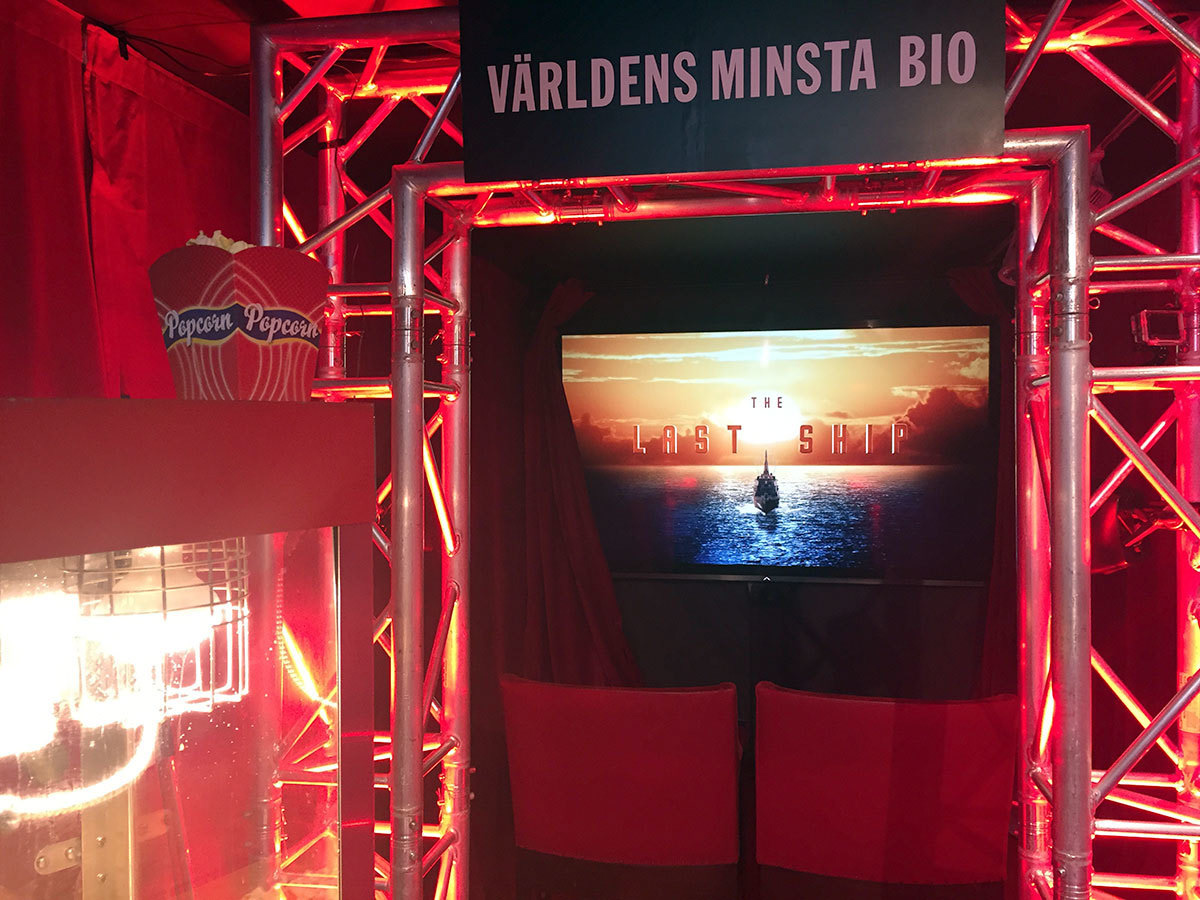 TNT Skulle lansera den tredje säsongen av dramaserien The Last Ship i Sverige. Problemet vara att kännedomen för TNT som kanal var låg och de tidigare säsongerna av serien hade haft låga tittarsiffror. Därför skapade vi ett koncept som skulle fungera som ett lanseringsevent men som också i sig hade ett PR-värde. Vi skapade Världens minsta biograf, på endast 13 m².